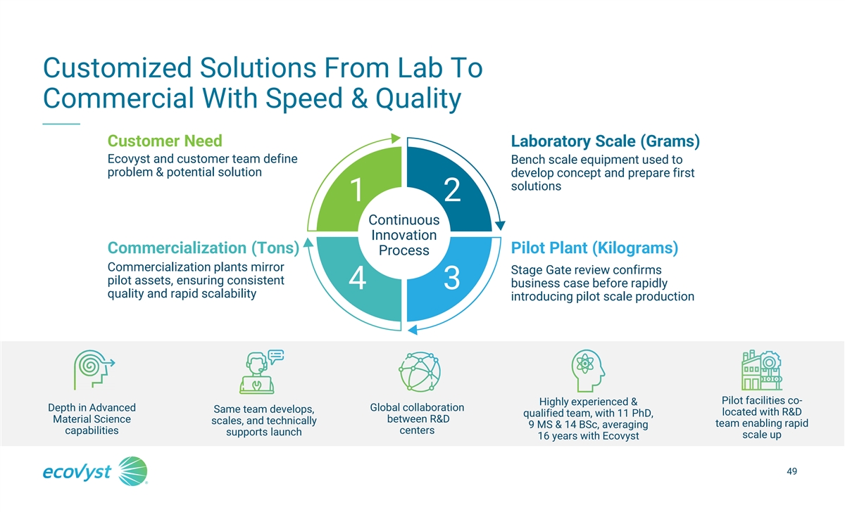 Customized Solutions From Lab To Commercial With Speed & Quality Customer Need Laboratory Scale (Grams) Ecovyst and customer team define Bench scale equipment used to problem & potential solution develop concept and prepare first solutions 1 2 Continuous Innovation Commercialization (Tons) Pilot Plant (Kilograms) Process Commercialization plants mirror Stage Gate review confirms pilot assets, ensuring consistent business case before rapidly 4 3 quality and rapid scalability introducing pilot scale production Pilot facilities co- Highly experienced & Global collaboration Depth in Advanced Same team develops, located with R&D qualified team, with 11 PhD, Material Science between R&D scales, and technically team enabling rapid 9 MS & 14 BSc, averaging capabilities centers supports launch scale up 16 years with Ecovyst 49
