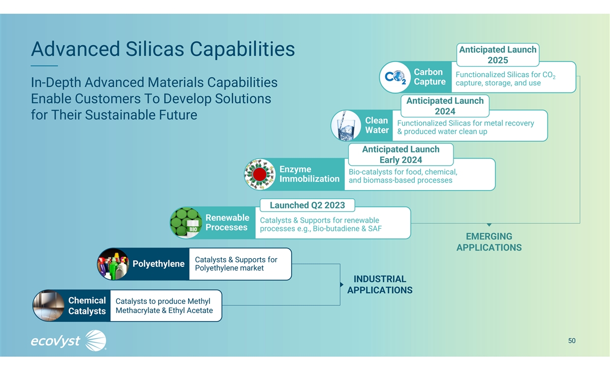 Anticipated Launch Advanced Silicas Capabilities 2025 Carbon Functionalized Silicas for CO 2 Capture capture, storage, and use In-Depth Advanced Materials Capabilities Enable Customers To Develop Solutions Anticipated Launch 2024 for Their Sustainable Future Clean Functionalized Silicas for metal recovery Water & produced water clean up Anticipated Launch Early 2024 Enzyme Bio-catalysts for food, chemical, Immobilization and biomass-based processes Launched Q2 2023 Renewable Catalysts & Supports for renewable Processes processes e.g., Bio-butadiene & SAF EMERGING APPLICATIONS Catalysts & Supports for Polyethylene Polyethylene market INDUSTRIAL APPLICATIONS Chemical Catalysts to produce Methyl Methacrylate & Ethyl Acetate Catalysts 50