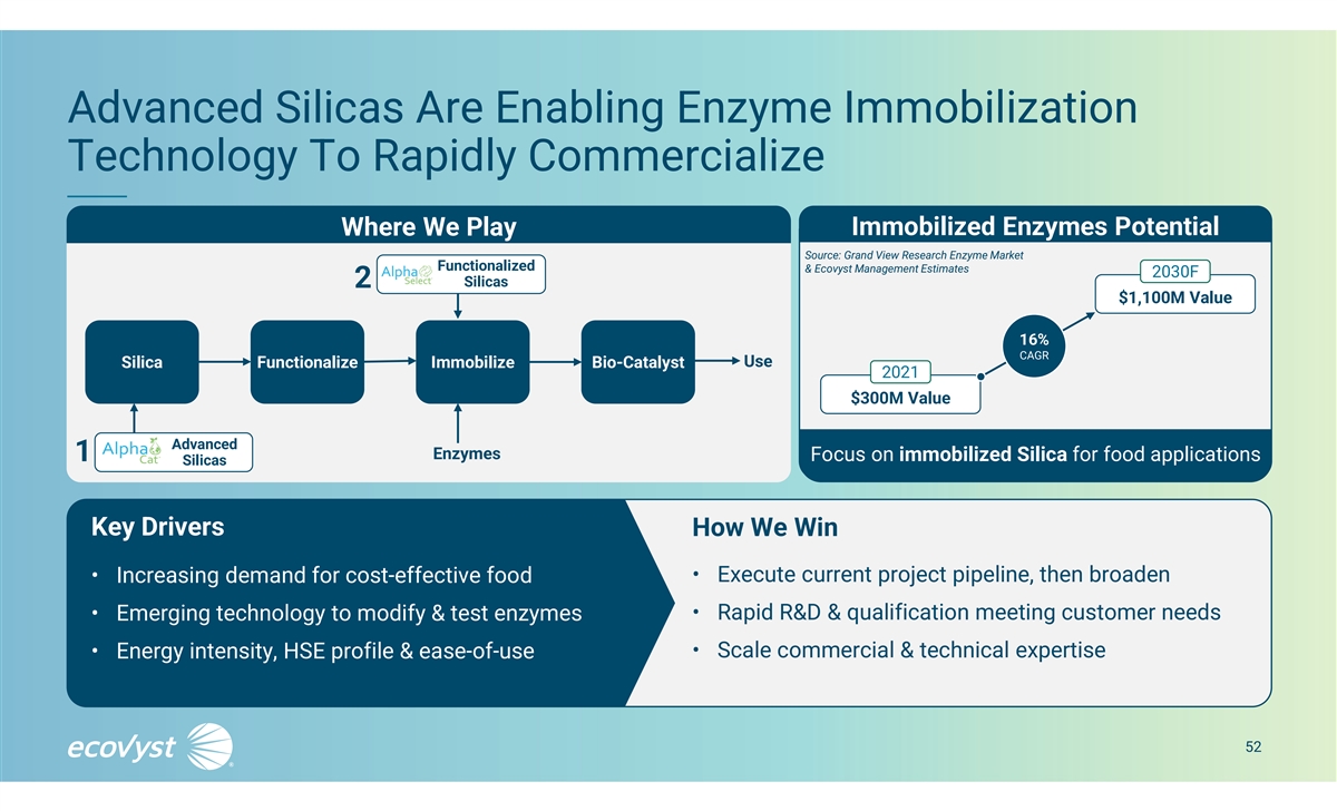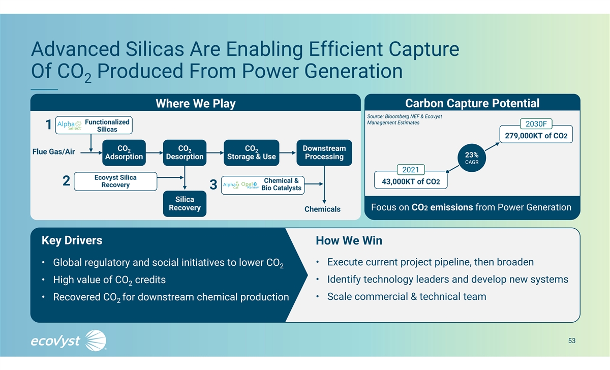 Advanced Silicas Are Enabling Enzyme Immobilization Technology To Rapidly Commercialize Where We Play Immobilized Enzymes Potential Source: Grand View Research Enzyme Market Functionalized & Ecovyst Management Estimates 2030F 2 Silicas $1,100M Value 16% CAGR Use Silica Functionalize Immobilize Bio-Catalyst 2021 $300M Value Advanced Enzymes 1 Focus on immobilized Silica for food applications Silicas Key Drivers How We Win • Execute current project pipeline, then broaden • Increasing demand for cost-effective food • Emerging technology to modify & test enzymes • Rapid R&D & qualification meeting customer needs • Scale commercial & technical expertise • Energy intensity, HSE profile & ease-of-use 52