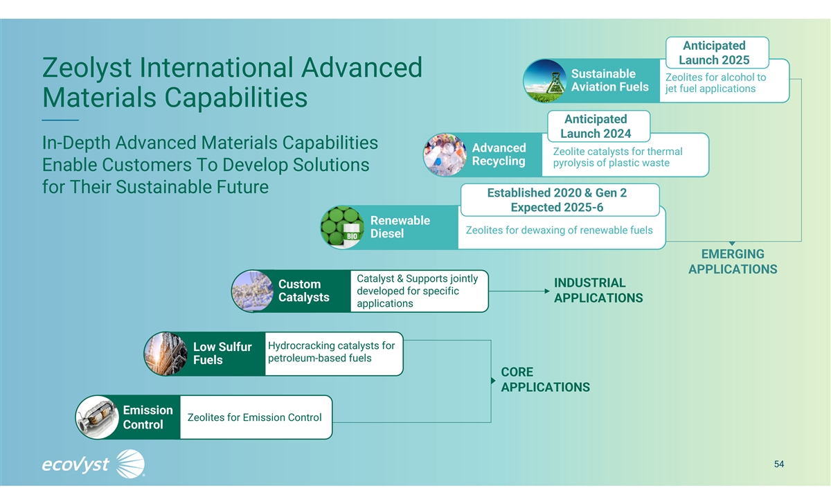 Anticipated Launch 2025 Zeolyst International Advanced Sustainable Zeolites for alcohol to Aviation Fuels jet fuel applications Materials Capabilities Anticipated Launch 2024 In-Depth Advanced Materials Capabilities Advanced Zeolite catalysts for thermal Recycling pyrolysis of plastic waste Enable Customers To Develop Solutions for Their Sustainable Future Established 2020 & Gen 2 Expected 2025-6 Renewable Zeolites for dewaxing of renewable fuels Diesel EMERGING APPLICATIONS Catalyst & Supports jointly INDUSTRIAL Custom developed for specific Catalysts APPLICATIONS applications Hydrocracking catalysts for Low Sulfur petroleum-based fuels Fuels CORE APPLICATIONS Emission Zeolites for Emission Control Control 54