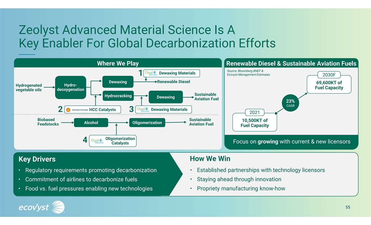 Zeolyst Advanced Material Science Is A Key Enabler For Global Decarbonization Efforts Where We Play Renewable Diesel & Sustainable Aviation Fuels Source: Bloomberg BNEF & Dewaxing Materials 1 Ecovyst Management Estimates 2030F Renewable Diesel Dewaxing 69,600KT of Hydro- Hydrogenated Fuel Capacity deoxygenation vegetable oils Sustainable Hydrocracking Dewaxing Aviation Fuel 23% CAGR HCC Catalysts Dewaxing Materials 2 3 2021 Biobased Sustainable 10,500KT of Alcohol Oligomerization Feedstocks Aviation Fuel Fuel Capacity Oligomerization 4 Focus on growing with current & new licensors Catalysts How We Win Key Drivers • Regulatory requirements promoting decarbonization • Established partnerships with technology licensors • Commitment of airlines to decarbonize fuels • Staying ahead through innovation • Food vs. fuel pressures enabling new technologies • Propriety manufacturing know-how 55