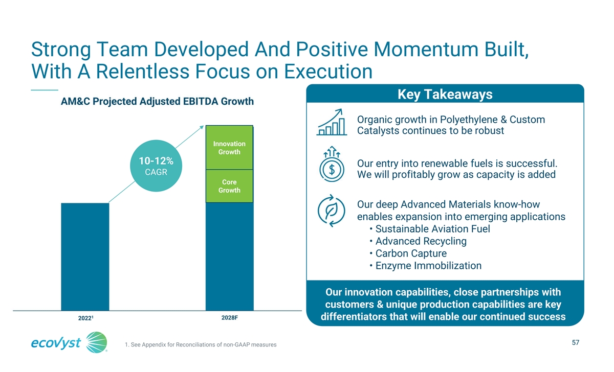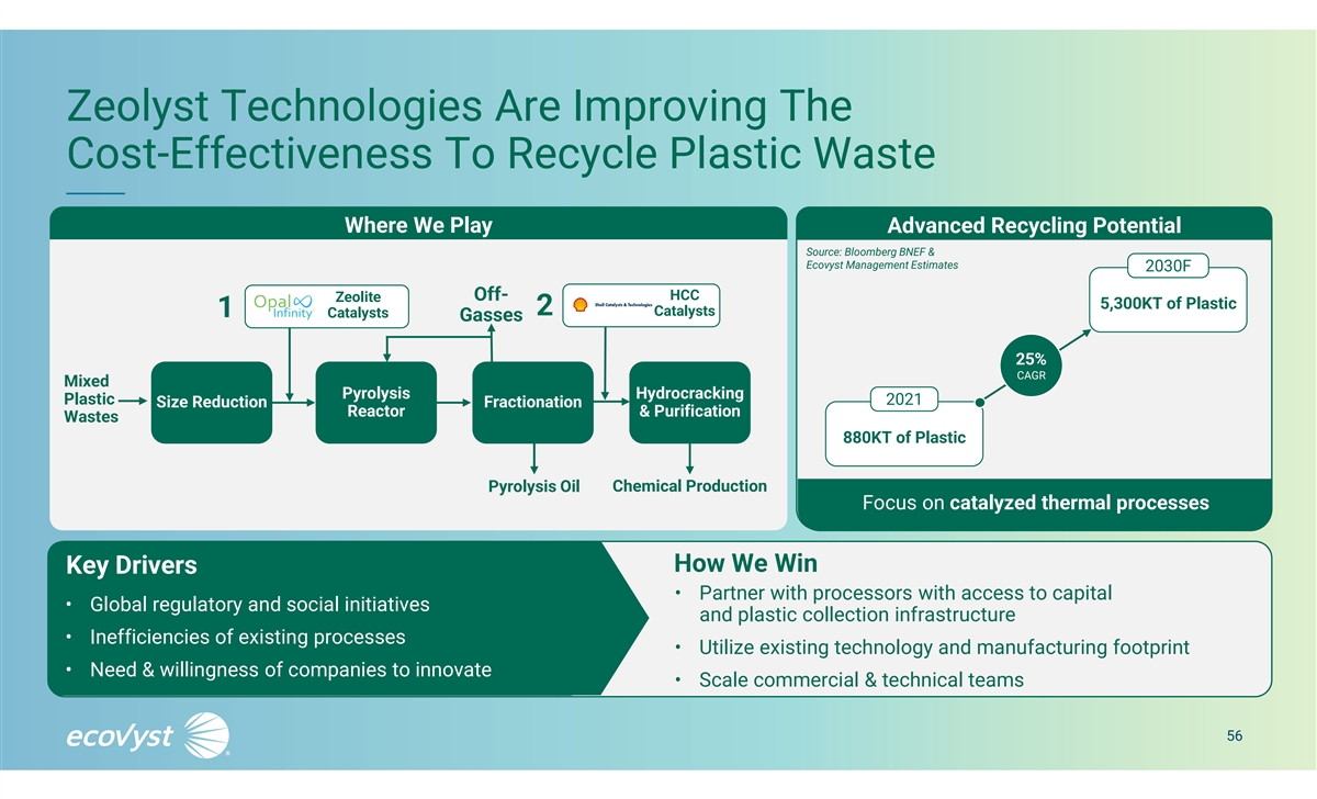 Zeolyst Technologies Are Improving The Cost-Effectiveness To Recycle Plastic Waste Where We Play Advanced Recycling Potential Source: Bloomberg BNEF & Ecovyst Management Estimates 2030F Off- HCC Zeolite 5,300KT of Plastic 2 Catalysts 1 Catalysts Gasses 25% CAGR Mixed Pyrolysis Hydrocracking Plastic 2021 Size Reduction Fractionation Reactor & Purification Wastes 880KT of Plastic Pyrolysis Oil Chemical Production Focus on catalyzed thermal processes How We Win Key Drivers • Partner with processors with access to capital • Global regulatory and social initiatives and plastic collection infrastructure • Inefficiencies of existing processes • Utilize existing technology and manufacturing footprint • Need & willingness of companies to innovate • Scale commercial & technical teams 56