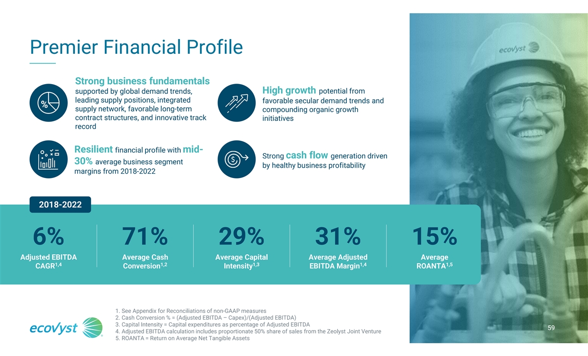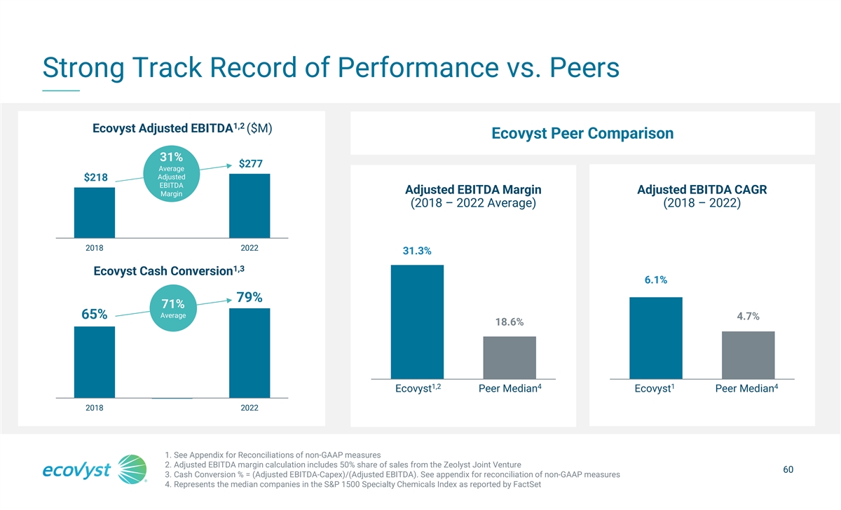 Premier Financial Profile Strong business fundamentals supported by global demand trends, High growth potential from leading supply positions, integrated favorable secular demand trends and % supply network, favorable long-term compounding organic growth contract structures, and innovative track initiatives record Resilient financial profile with mid- Strong cash flow generation driven 30% average business segment by healthy business profitability margins from 2018-2022 2018-2022 6% 71% 29% 31% 15% Adjusted EBITDA Average Cash Average Capital Average Adjusted Average 1,4 1,2 1,3 1,4 1,5 CAGR Conversion Intensity EBITDA Margin ROANTA 1. See Appendix for Reconciliations of non-GAAP measures 2. Cash Conversion % = (Adjusted EBITDA – Capex)/(Adjusted EBITDA) 3. Capital Intensity = Capital expenditures as percentage of Adjusted EBITDA 59 4. Adjusted EBITDA calculation includes proportionate 50% share of sales from the Zeolyst Joint Venture 5. ROANTA = Return on Average Net Tangible Assets