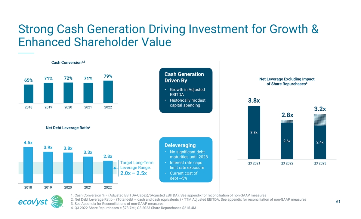 Strong Track Record of Performance vs. Peers 1,2 Ecovyst Adjusted EBITDA ($M) Ecovyst Peer Comparison 31% $277 Average Adjusted $218 EBITDA Adjusted EBITDA Margin Adjusted EBITDA CAGR Margin (2018 – 2022 Average) (2018 – 2022) 2018 2022 31.3% 1,3 Ecovyst Cash Conversion 6.1% 79% 71% Average 65% 4.7% 18.6% 1,2 4 1 4 Ecovyst Peer Median3 Ecovyst Peer Median3 Ecovyst Peer Median Ecovyst Peer Median 2018 2022 1. See Appendix for Reconciliations of non-GAAP measures 2. Adjusted EBITDA margin calculation includes 50% share of sales from the Zeolyst Joint Venture 60 3. Cash Conversion % = (Adjusted EBITDA-Capex)/(Adjusted EBITDA). See appendix for reconciliation of non-GAAP measures 4. Represents the median companies in the S&P 1500 Specialty Chemicals Index as reported by FactSet