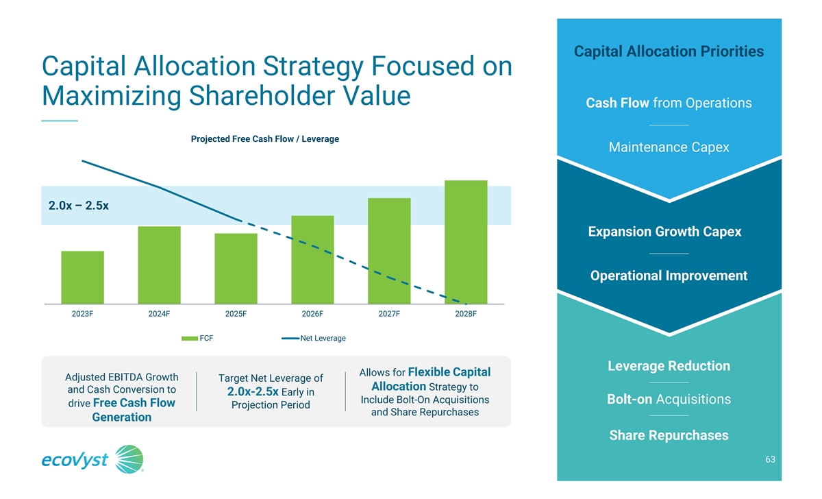 Capital Allocation Priorities Capital Allocation Strategy Focused on Maximizing Shareholder Value Cash Flow from Operations Projected Free Cash Flow / Leverage Maintenance Capex $200 $150 2.0x – 2.5x $100 Expansion Growth Capex $50 Operational Improvement $- 2023F 2024F 2025F 2026F 2027F 2028F FCF Net Leverage Leverage Reduction Allows for Flexible Capital Adjusted EBITDA Growth Target Net Leverage of Allocation Strategy to and Cash Conversion to 2.0x-2.5x Early in Include Bolt-On Acquisitions Bolt-on Acquisitions drive Free Cash Flow Projection Period and Share Repurchases Generation Share Repurchases 63