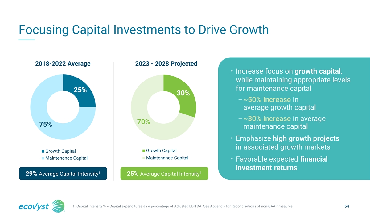 Focusing Capital Investments to Drive Growth 2018-2022 Average 2023 - 2028 Projected • Increase focus on growth capital, while maintaining appropriate levels for maintenance capital 25% 30% –~50% increase in average growth capital –~30% increase in average 70% 75% maintenance capital • Emphasize high growth projects in associated growth markets Growth Capital Growth Capital Maintenance Capital Maintenance Capital • Favorable expected financial investment returns 1 1 29% Average Capital Intensity 25% Average Capital Intensity 1. Capital Intensity % = Capital expenditures as a percentage of Adjusted EBITDA. See Appendix for Reconciliations of non-GAAP meaures 64