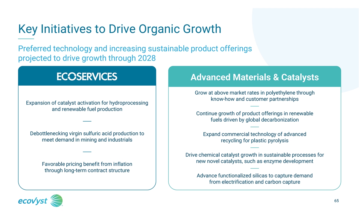 Key Initiatives to Drive Organic Growth Preferred technology and increasing sustainable product offerings projected to drive growth through 2028 Advanced Materials & Catalysts Grow at above market rates in polyethylene through know-how and customer partnerships Expansion of catalyst activation for hydroprocessing and renewable fuel production Continue growth of product offerings in renewable fuels driven by global decarbonization Debottlenecking virgin sulfuric acid production to Expand commercial technology of advanced meet demand in mining and industrials recycling for plastic pyrolysis Drive chemical catalyst growth in sustainable processes for new novel catalysts, such as enzyme development Favorable pricing benefit from inflation through long-term contract structure Advance functionalized silicas to capture demand from electrification and carbon capture 65