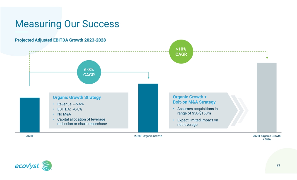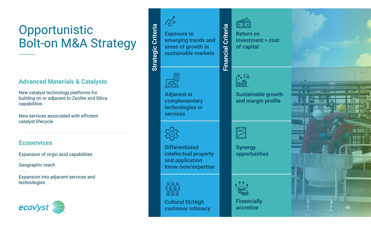 Opportunistic Exposure to Return on emerging trends and investment > cost Bolt-on M&A Strategy areas of growth in of capital sustainable markets Advanced Materials & Catalysts New catalyst technology platforms for Adjacent or Sustainable growth building on or adjacent to Zeolite and Silica complementary and margin profile capabilities technologies or services New services associated with efficient catalyst lifecycle Ecoservices Differentiated Synergy Expansion of virgin acid capabilities intellectual property opportunities and application Geographic reach know-how/expertise Expansion into adjacent services and technologies Financially Cultural fit/High 66 accretive customer intimacy Strategic Criteria Financial Criteria