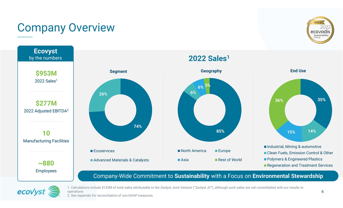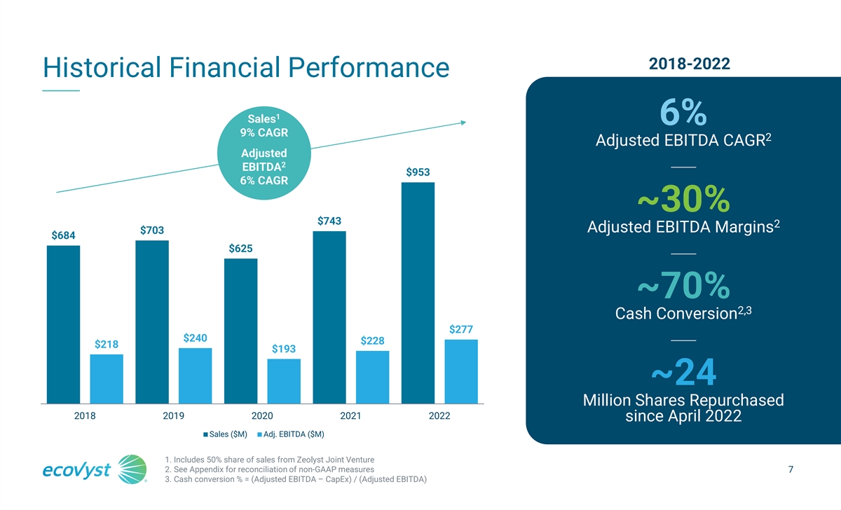 Company Overview E Ec co ov vy ys st t 1 b by y t th he e n nu um mb be er rs s 2022 Sales Geography End Use Segment $953M 1 2022 Sales 3% 6% 6% 26% 35% 36% $277M 2 2022 Adjusted EBITDA 74% 14% 85% 15% 10 Manufacturing Facilities Industrial, Mining & automotive Ecoservices North America Europe Clean Fuels, Emission Control & Other Polymers & Engineered Plastics Asia Rest of World Advanced Materials & Catalysts ~880 Regeneration and Treatment Services Employees Company-Wide Commitment to Sustainability with a Focus on Environmental Stewardship 1. Calculations include $133M of total sales attributable to the Zeolyst Joint Venture (“Zeolyst JV”), although such sales are not consolidated with our results or operations 6 2. See Appendix for reconciliation of non-GAAP measures