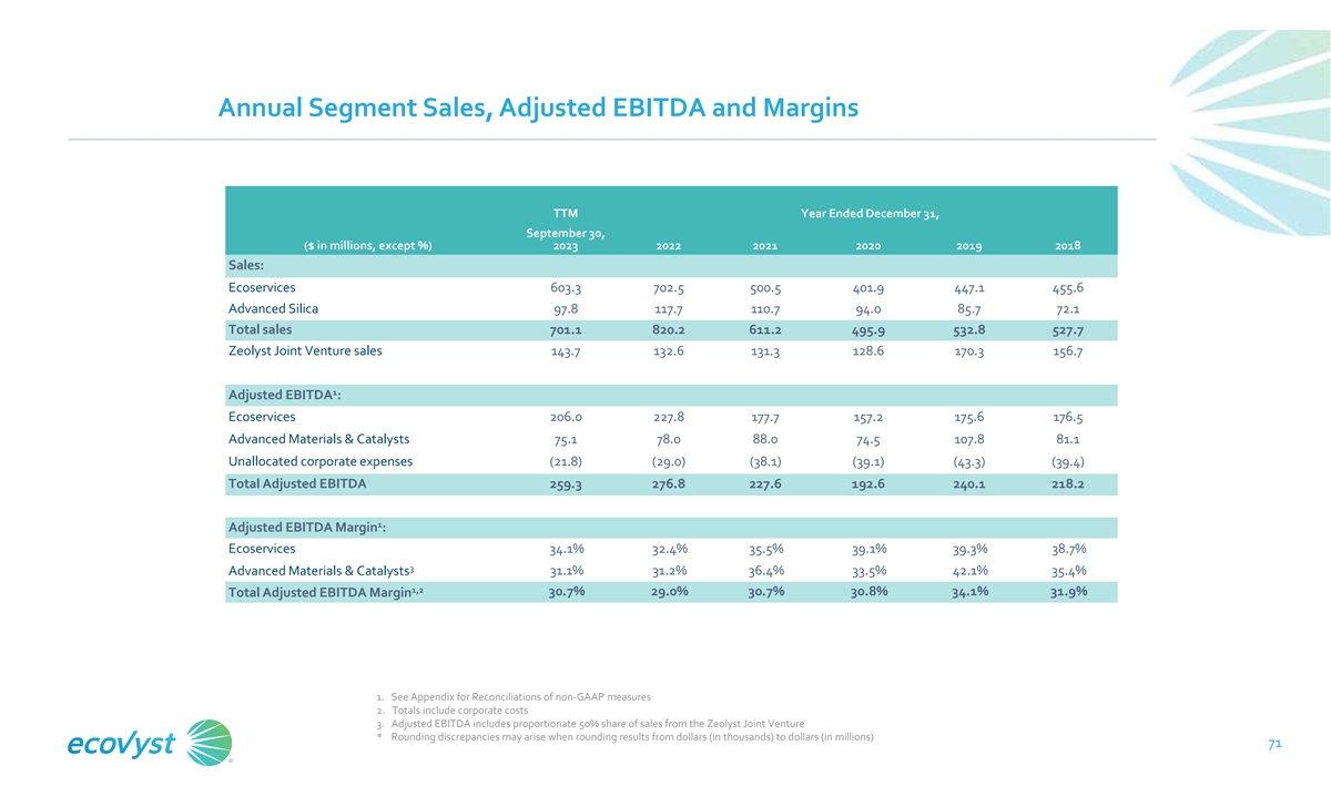 Annual Segment Sales, Adjusted EBITDA and Margins TTM Year Ended December 31, September 30, ($ in millions, except %) 2023 2022 2021 2020 2019 2018 Sales: Ecoservices 603.3 702.5 500.5 401.9 447.1 455.6 Advanced Silica 97.8 117.7 110.7 94.0 85.7 72.1 Total sales 701.1 820.2 611.2 495.9 532.8 527.7 Zeolyst Joint Venture sales 143.7 132.6 131.3 128.6 170.3 156.7 1 Adjusted EBITDA : Ecoservices 206.0 227.8 177.7 157.2 175.6 176.5 Advanced Materials & Catalysts 75.1 78.0 88.0 74.5 107.8 81.1 Unallocated corporate expenses (21.8) (29.0) (38.1) (39.1) (43.3) (39.4) Total Adjusted EBITDA 259.3 276.8 227.6 192.6 240.1 218.2 1 Adjusted EBITDA Margin : Ecoservices 34.1% 32.4% 35.5% 39.1% 39.3% 38.7% 3 Advanced Materials & Catalysts 31.1% 31.2% 36.4% 33.5% 42.1% 35.4% 1,2 30.7% 29.0% 30.7% 30.8% 34.1% 31.9% Total Adjusted EBITDA Margin 1. See Appendix for Reconciliations of non-GAAP measures 2. Totals include corporate costs 3. Adjusted EBITDA includes proportionate 50% share of sales from the Zeolyst Joint Venture * Rounding discrepancies may arise when rounding results from dollars (in thousands) to dollars (in millions) 71