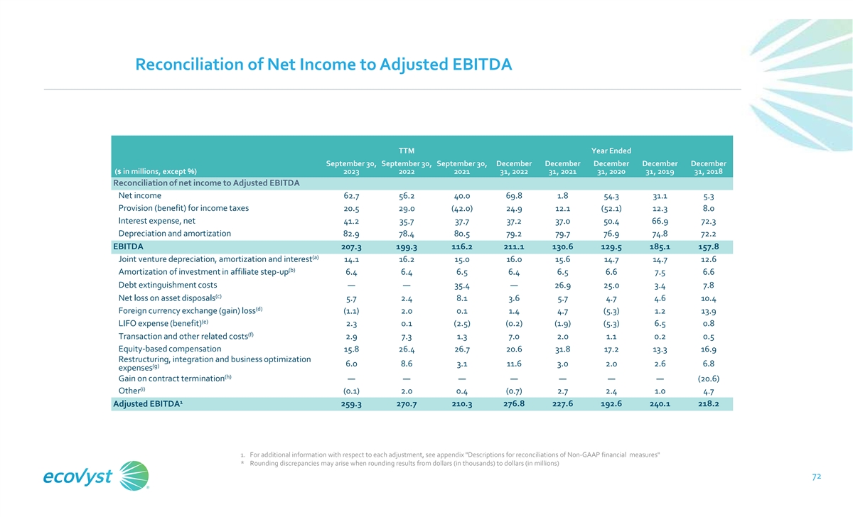 Reconciliation of Net Income to Adjusted EBITDA TTM Year Ended September 30, September 30, September 30, December December December December December ($ in millions, except %) 2023 2022 2021 31, 2022 31, 2021 31, 2020 31, 2019 31, 2018 Reconciliation of net income to Adjusted EBITDA Net income 62.7 56.2 40.0 69.8 1.8 54.3 31.1 5.3 Provision (benefit) for income taxes 20.5 29.0 (42.0) 24.9 12.1 (52.1) 12.3 8.0 Interest expense, net 41.2 35.7 37.7 37.2 37.0 50.4 66.9 72.3 Depreciation and amortization 82.9 78.4 80.5 79.2 79.7 76.9 74.8 72.2 EBITDA 207.3 199.3 116.2 211.1 130.6 129.5 185.1 157.8 (a) Joint venture depreciation, amortization and interest 14.1 16.2 15.0 16.0 15.6 14.7 14.7 12.6 (b) Amortization of investment in affiliate step-up 6.4 6.4 6.5 6.4 6.5 6.6 7.5 6.6 Debt extinguishment costs — — 35.4 — 26.9 25.0 3.4 7.8 (c) Net loss on asset disposals 5.7 2.4 8.1 3.6 5.7 4.7 4.6 10.4 (d) Foreign currency exchange (gain) loss (1.1) 2.0 0.1 1.4 4.7 (5.3) 1.2 13.9 (e) LIFO expense (benefit) 2.3 0.1 (2.5) (0.2) (1.9) (5.3) 6.5 0.8 (f) Transaction and other related costs 2.9 7.3 1.3 7.0 2.0 1.1 0.2 0.5 Equity-based compensation 15.8 26.4 26.7 20.6 31.8 17.2 13.3 16.9 Restructuring, integration and business optimization 6.0 8.6 3.1 11.6 3.0 2.0 2.6 6.8 (g) expenses (h) Gain on contract termination — — — — — — — (20.6) (i) Other (0.1) 2.0 0.4 (0.7) 2.7 2.4 1.0 4.7 1 Adjusted EBITDA 259.3 270.7 210.3 276.8 227.6 192.6 240.1 218.2 1. For additional information with respect to each adjustment, see appendix Descriptions for reconciliations of Non-GAAP financial measures * Rounding discrepancies may arise when rounding results from dollars (in thousands) to dollars (in millions) 72