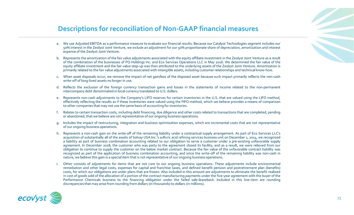 Descriptions for reconciliation of Non-GAAP financial measures a. We use Adjusted EBITDA as a performance measure to evaluate our financial results. Because our Catalyst Technologies segment includes our 50% interest in the Zeolyst Joint Venture, we include an adjustment for our 50% proportionate share of depreciation, amortization and interest expense of the Zeolyst Joint Venture. b. Represents the amortization of the fair value adjustments associated with the equity affiliate investment in the Zeolyst Joint Venture as a result of the combination of the businesses of PQ Holdings Inc. and Eco Services Operations LLC in May 2016. We determined the fair value of the equity affiliate investment and the fair value step-up was then attributed to the underlying assets of the Zeolyst Joint Venture. Amortization is primarily related to the fair value adjustments associated with intangible assets, including customer relationships and technical know-how. c. When asset disposals occur, we remove the impact of net gain/loss of the disposed asset because such impact primarily reflects the non-cash write-off of long-lived assets no longer in use. d. Reflects the exclusion of the foreign currency transaction gains and losses in the statements of income related to the non-permanent intercompany debt denominated in local currency translated to U.S. dollars. e. Represents non-cash adjustments to the Company’s LIFO reserves for certain inventories in the U.S. that are valued using the LIFO method, effectively reflecting the results as if these inventories were valued using the FIFO method, which we believe provides a means of comparison to other companies that may not use the same basis of accounting for inventories. f. Relates to certain transaction costs, including debt financing, due diligence and other costs related to transactions that are completed, pending or abandoned, that we believe are not representative of our ongoing business operations. g. Includes the impact of restructuring, integration and business optimization expenses, which are incremental costs that are not representative of our ongoing business operations. h. Represents a non-cash gain on the write-off of the remaining liability under a contractual supply arrangement. As part of Eco Services LLC’s acquisition of substantially all of the assets of Solvay USA Inc.’s sulfuric acid refining services business unit on December 1, 2014, we recognized a liability as part of business combination accounting related to our obligation to serve a customer under a pre-existing unfavorable supply agreement. In December 2018, the customer who was party to the agreement closed its facility, and as a result, we were relieved from our obligation to continue to supply the customer on the below market contract. Because the fair value of the unfavorable contract liability was recognized as part of the application of business combination accounting, and since the write-off of the remaining liability was non-cash in nature, we believe this gain is a special item that is not representative of our ongoing business operations. i. Other consists of adjustments for items that are not core to our ongoing business operations. These adjustments include environmental remediation and other legal costs, expenses for capital and franchise taxes, and defined benefit pension and postretirement plan (benefits) costs, for which our obligations are under plans that are frozen. Also included in this amount are adjustments to eliminate the benefit realized in cost of goods sold of the allocation of a portion of the contract manufacturing payments under the five-year agreement with the buyer of the Performance Chemicals business to the financing obligation under the failed sale-leaseback. Included in this line-item are rounding discrepancies that may arise from rounding from dollars (in thousands) to dollars (in millions). 73