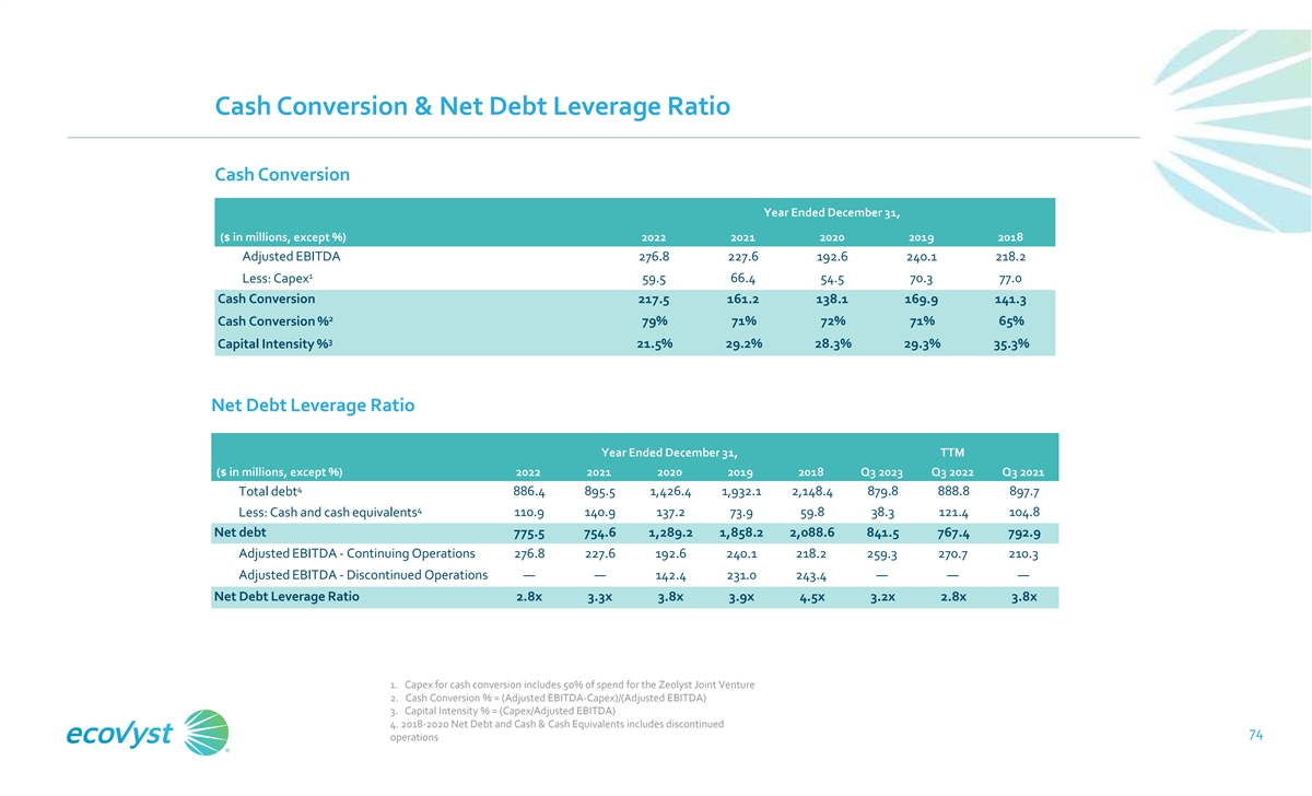 Cash Conversion & Net Debt Leverage Ratio Cash Conversion Year Ended December 31, ($ in millions, except %) 2022 2021 2020 2019 2018 Adjusted EBITDA 276.8 227.6 192.6 240.1 218.2 1 Less: Capex 59.5 66.4 54.5 70.3 77.0 Cash Conversion 217.5 161.2 138.1 169.9 141.3 2 Cash Conversion % 79% 71% 72% 71% 65% 3 Capital Intensity % 21.5% 29.2% 28.3% 29.3% 35.3% Net Debt Leverage Ratio Year Ended December 31, TTM ($ in millions, except %) 2022 2021 2020 2019 2018 Q3 2023 Q3 2022 Q3 2021 4 Total debt 886.4 895.5 1,426.4 1,932.1 2,148.4 879.8 888.8 897.7 4 Less: Cash and cash equivalents 110.9 140.9 137.2 73.9 59.8 38.3 121.4 104.8 Net debt 775.5 754.6 1,289.2 1,858.2 2,088.6 841.5 767.4 792.9 Adjusted EBITDA - Continuing Operations 276.8 227.6 192.6 240.1 218.2 259.3 270.7 210.3 Adjusted EBITDA - Discontinued Operations — — 142.4 231.0 243.4 — — — Net Debt Leverage Ratio 2.8x 3.3x 3.8x 3.9x 4.5x 3.2x 2.8x 3.8x 1. Capex for cash conversion includes 50% of spend for the Zeolyst Joint Venture 2. Cash Conversion % = (Adjusted EBITDA-Capex)/(Adjusted EBITDA) 3. Capital Intensity % = (Capex/Adjusted EBITDA) 4. 2018-2020 Net Debt and Cash & Cash Equivalents includes discontinued 74 operations
