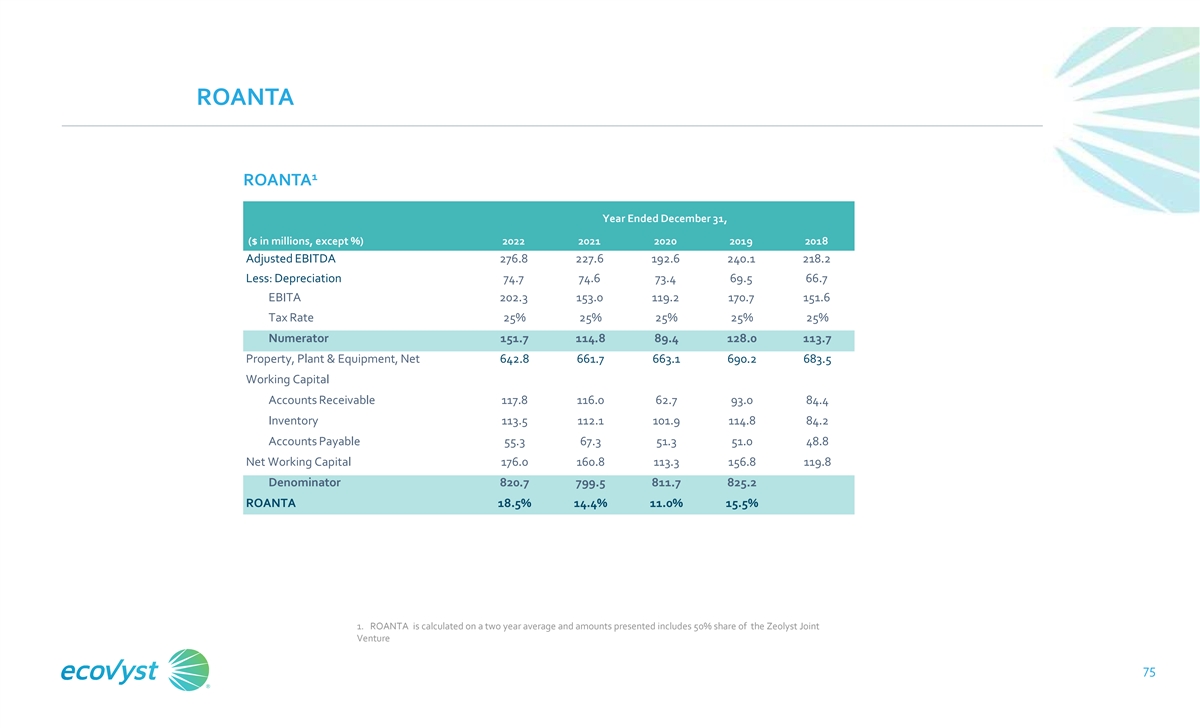 ROANTA 1 ROANTA Year Ended December 31, ($ in millions, except %) 2022 2021 2020 2019 2018 Adjusted EBITDA 276.8 227.6 192.6 240.1 218.2 Less: Depreciation 74.7 74.6 73.4 69.5 66.7 EBITA 202.3 153.0 119.2 170.7 151.6 Tax Rate 25% 25% 25% 25% 25% Numerator 151.7 114.8 89.4 128.0 113.7 Property, Plant & Equipment, Net 642.8 661.7 663.1 690.2 683.5 Working Capital Accounts Receivable 117.8 116.0 62.7 93.0 84.4 Inventory 113.5 112.1 101.9 114.8 84.2 Accounts Payable 55.3 67.3 51.3 51.0 48.8 Net Working Capital 176.0 160.8 113.3 156.8 119.8 Denominator 820.7 799.5 811.7 825.2 ROANTA 18.5% 14.4% 11.0% 15.5% 1. ROANTA is calculated on a two year average and amounts presented includes 50% share of the Zeolyst Joint Venture 75
