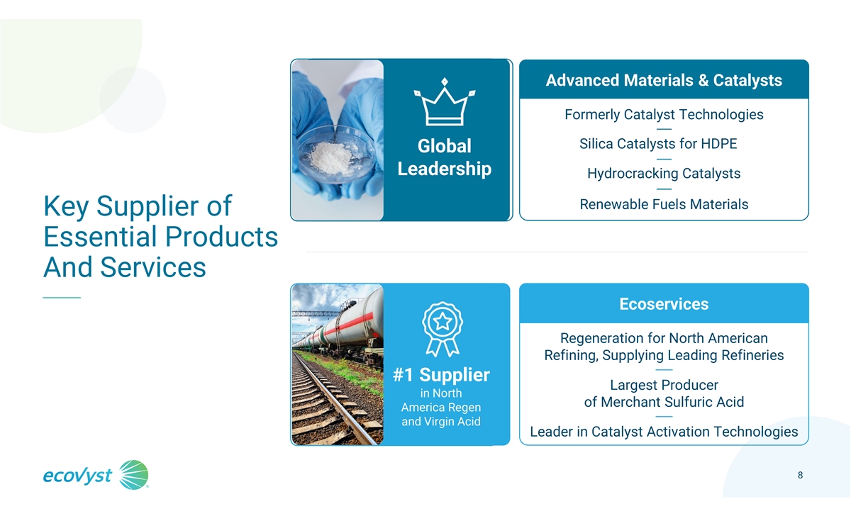 Advanced Materials & Catalysts Formerly Catalyst Technologies Silica Catalysts for HDPE Global Leadership Hydrocracking Catalysts Renewable Fuels Materials Key Supplier of Essential Products And Services Ecoservices Regeneration for North American Refining, Supplying Leading Refineries #1 Supplier Largest Producer in North of Merchant Sulfuric Acid America Regen and Virgin Acid Leader in Catalyst Activation Technologies 8